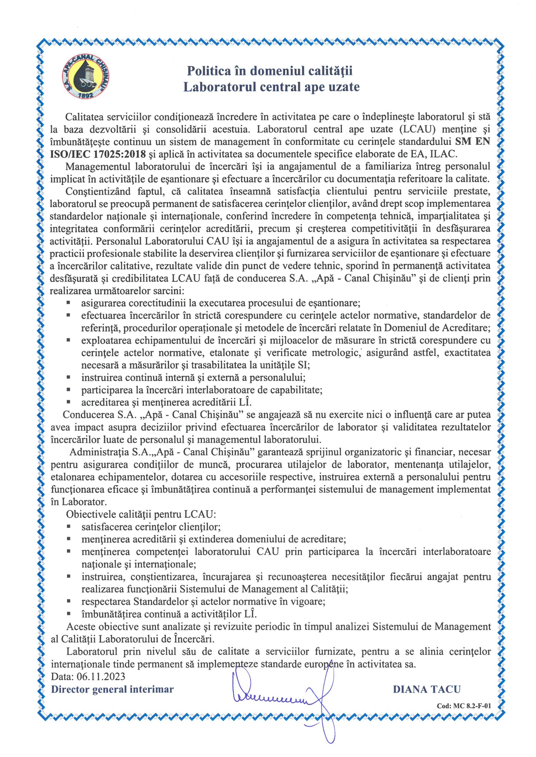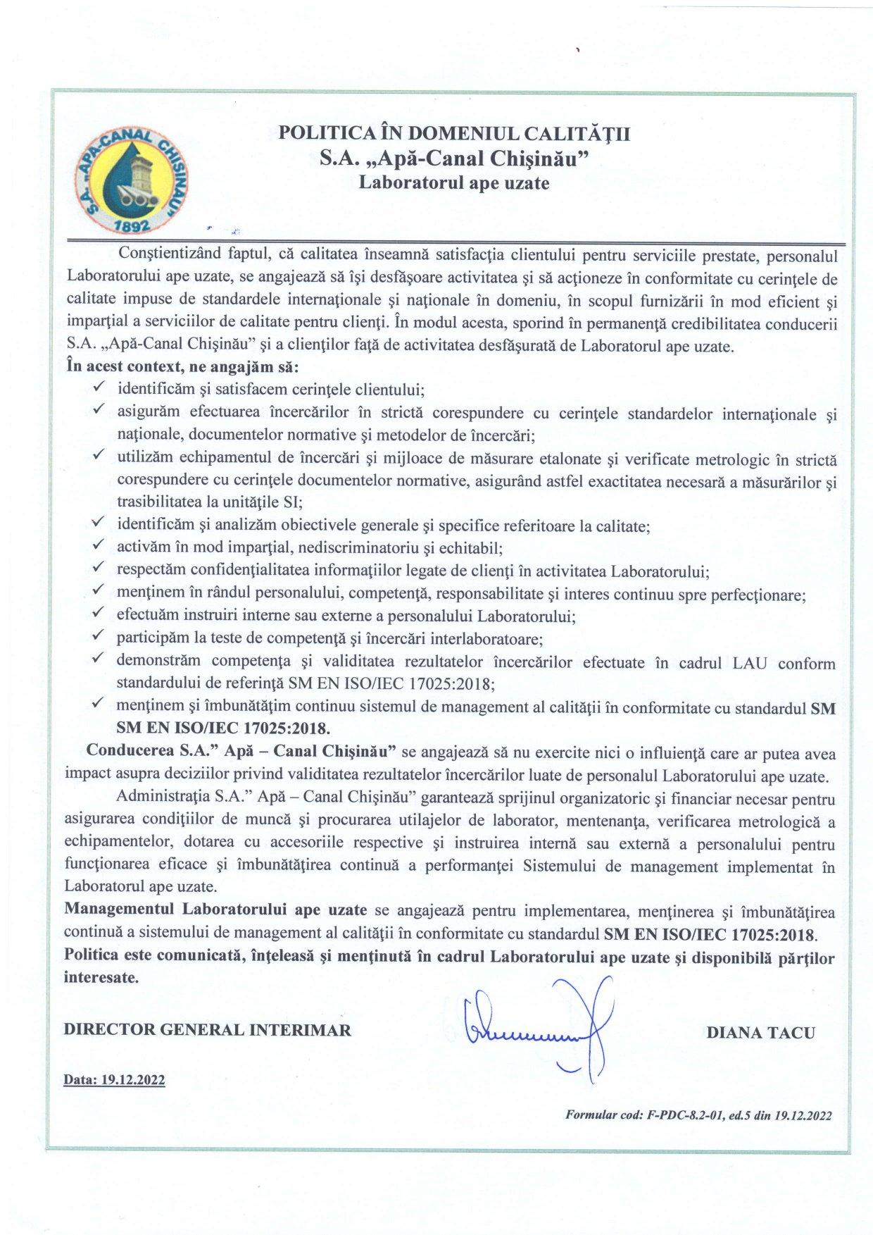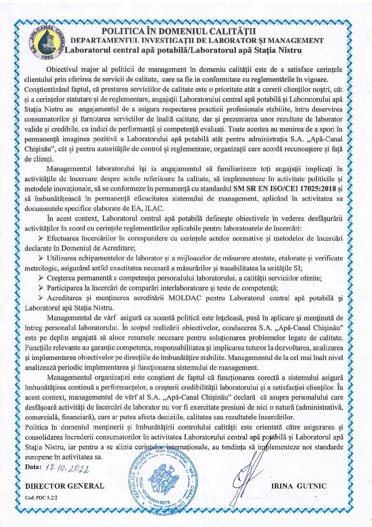 Declaratie de politica in domeniul calitatii